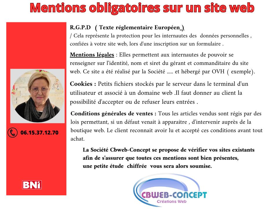 Si vous souhaitez exercer l’un des droits susmentionnés ou recevoir plus d’informations, veuillez contacter notre délégué à la protection des données à l’aide des informations fournies ci-dessous : Mme Arrighi Christine – Gérante de l’Entreprise Cbweb-Concept